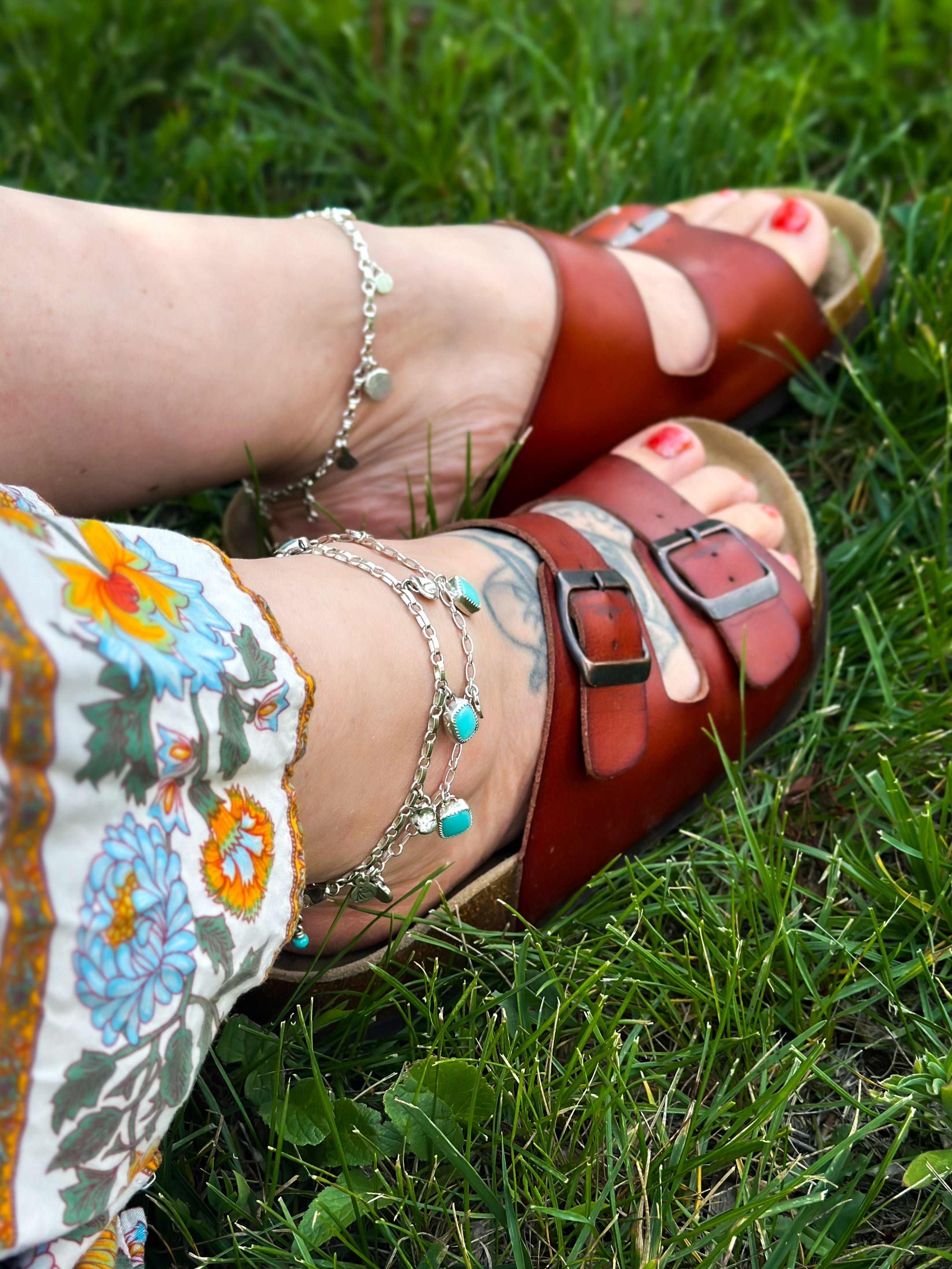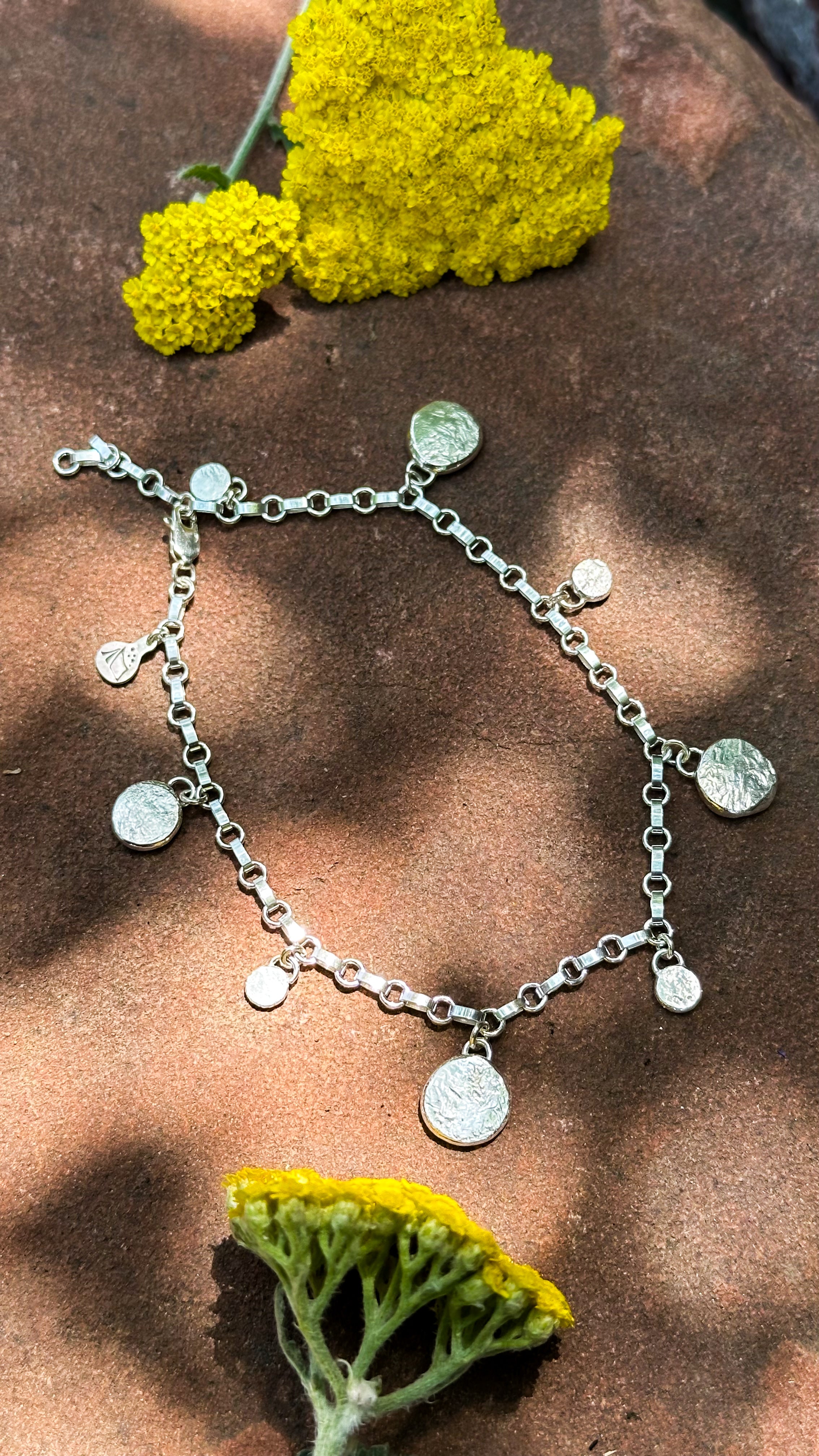 Classic charm anklet featuring unique handforged silver medallions made with recycled silver. These pieces are the perfect accessory for your next summer vacay or everyday wear!